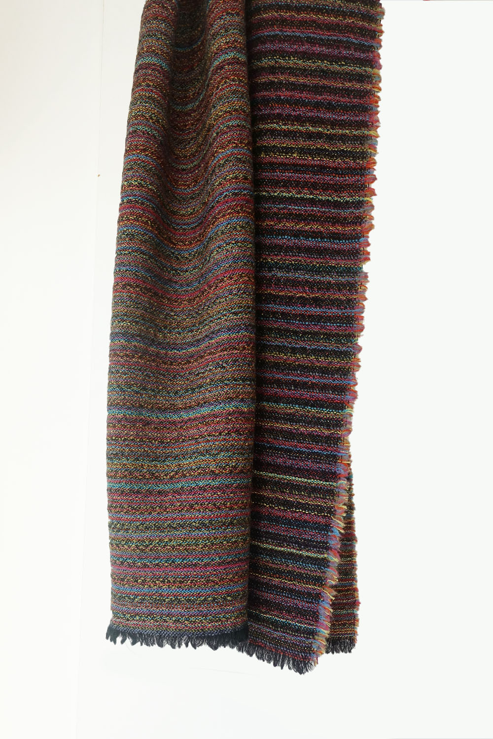 Riti-huivin materiaali on 100 % mulesingvapaata, kevyesti vanutettua villaa. Huivi on kudottu mustaan loimeen, joka näkyy lyhyenä hapsuna huivin päissä. Huivin kääntöpuolella on myös enemmän loimen väriä: mustaa. Hoida huivia tuulettamalla tai pese pesupussissa villapesuohjelmalla, max 30 astetta ja muotoile kosteana.